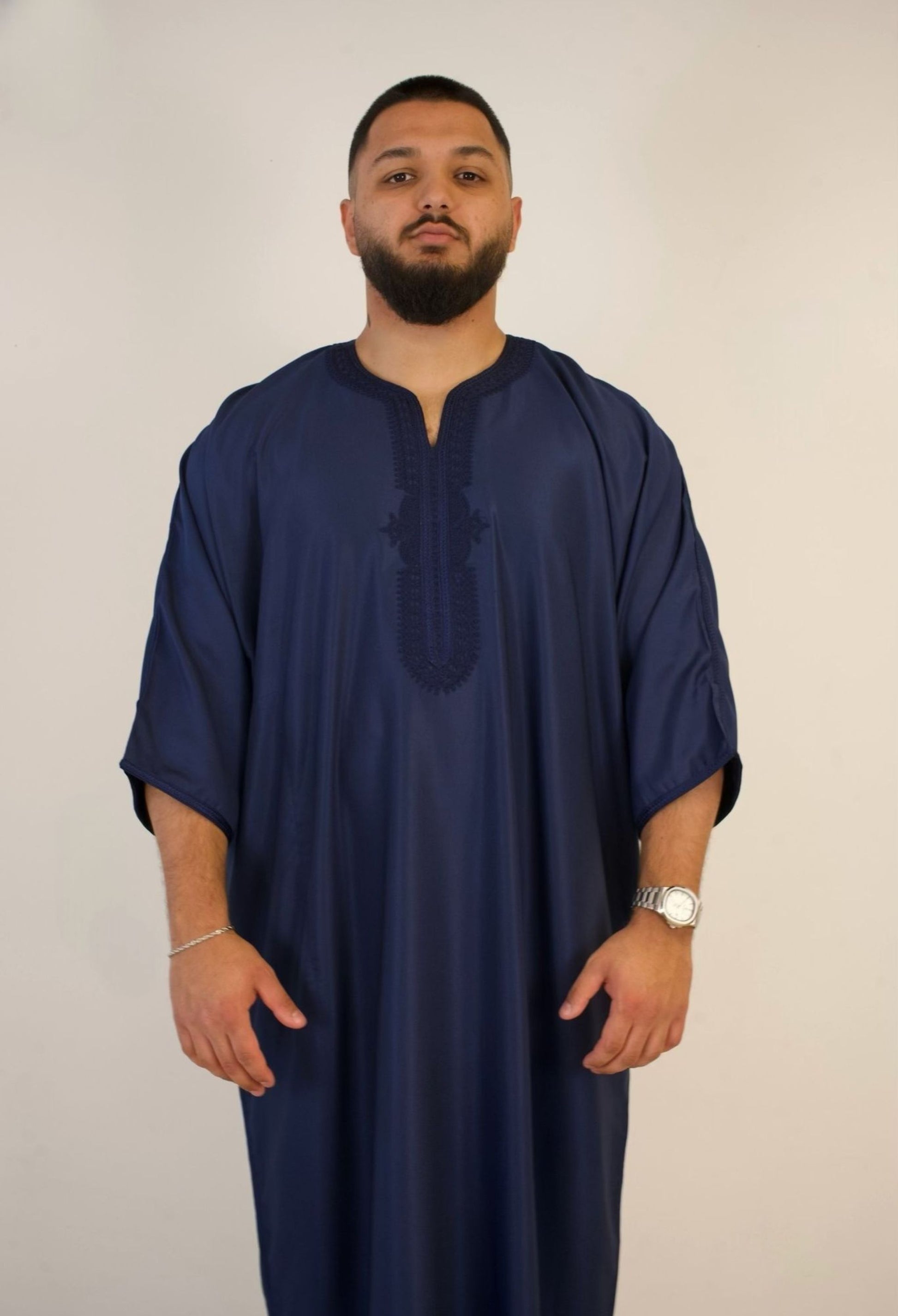 Diese elegante Gandoura wird in einer renommierten Werkstatt in Marokko von erfahrenen Handwerkern hergestellt. Sie überzeugt durch ihr zeitloses Design mit Viertellängensämlen, einem locker sitzenden Schnitt und einer Länge, die bis zum Knöchel reicht. Ihr robustes Material sorgt für lange Haltbarkeit und einen angenehmen Tragekomfort.